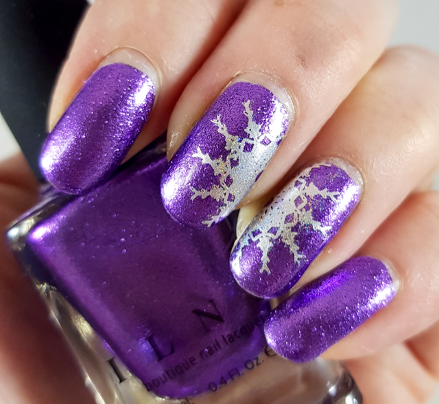 Sedan var planen att byta lack till nyårsafton, men det här höll så bra att jag faktiskt bara stämplade på en snöflinga och lät det bli min nyårsaftonsmanikyr. Jag dubbelstämplade med ett silverlack och ett silverhololack (som är så skirt att det knappt syns) från Born Pretty Store och Holiday Spirit-plattan från UberChic Beauty. Enkelt, men jag tycker det blev rätt snyggt ändå!