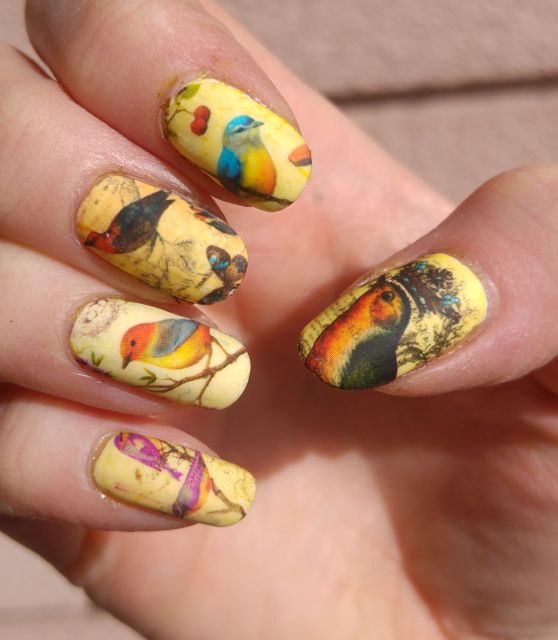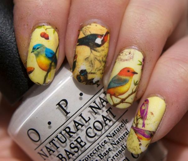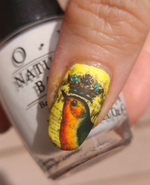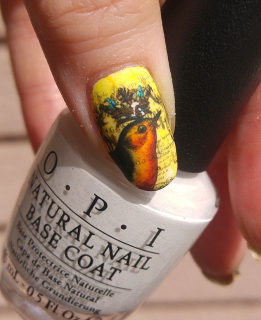 Veckans tema på Nail Art Sunday är vår, och är det något som är härligare än när fåglarna kommer tillbaka och börjar sjunga som tokiga? Jag valde därför några fina vattendekaler från Milv (Nr N 342, inköpta från She Sells Seashells) med fåglar till min vårmanikyr. De ska appliceras över en vit bas, så jag grundade med två lager av OPIs vita underlack Put a Coat On! Eftersom motivet känns lite gammaldags valde jag att lägga på ett matt överlack (Cirque Matte Look Top Coat).