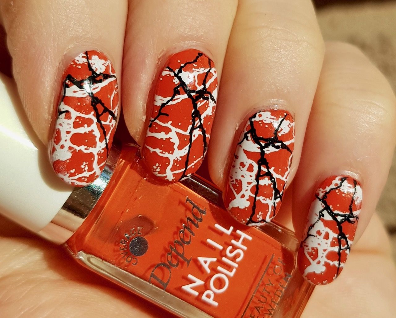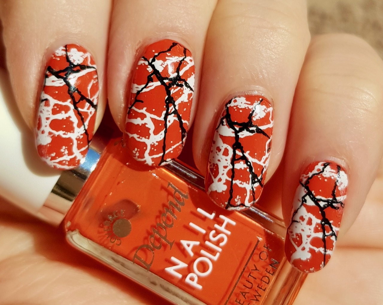 Det senaste temat hos Nail Polish Addicts är ”Turn the colour back” och går ut på att man ska basera sin manikyr på en färg som har varit årets färg hos Pantone. Färgen ska vara bas, och sedan får man göra dekor i vitt och svart. Jag valde 2012 års Pantonefärg, Tangerine Tango, och matchade den med Depend 644, ett pressprov från Rethinkkollektionen. Det matchar inte perfekt, men är bra nära i alla fall. Jag hade tre lager, fast det hade nog egentligen räckt med två, och det var lätt att måla med. Riktigt härligt glad färg!
