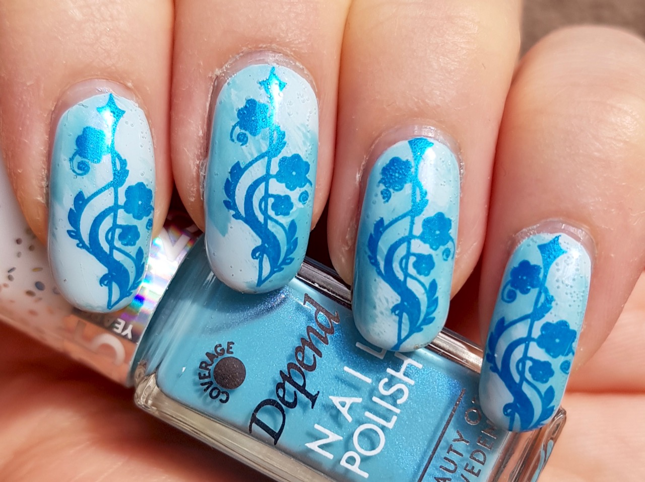 I botten hade jag Depend 7 day 7229 From a Different View, ett pressprov från Open Mind-kollektionen. Det täckte på två lager och var förvånansvärt bra att lacka med för att vara ett så ljust lack. Sedan torrborstade jag med Depend 610, ett pressprov från Tokyo Street-kollektionen 2019. Sedan stämplade jag med Hit the Bottle Blue-tiful och plattan Lesly Ornate. Jag tycker det blev riktigt fint! De två ljusa lacken ligger tillräckligt nära i färg för att ge ett lugnt intryck men ändå är tillräckligt olika för att det ska synas skillnad. Det har ändå sina fördelar att ha en så stor nagellackssamling att man kan hitta lack i precis den nyansen man vill ha!