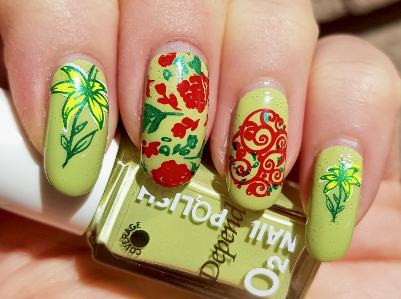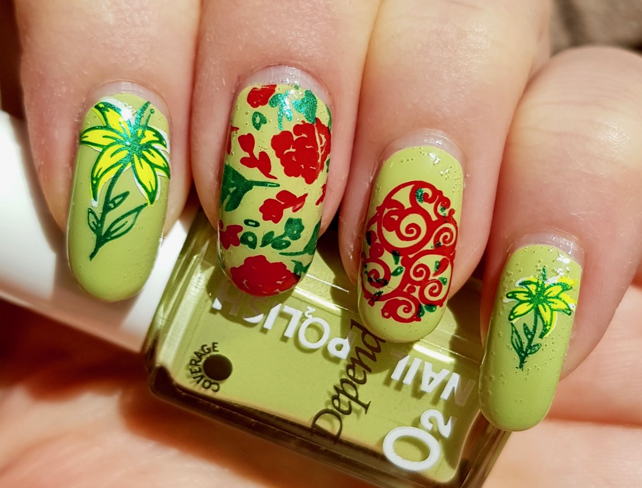 Jag stämplade med Maniology Bam! (vitt, som underlag till det gula), Beauty Bigbang Bright Yellow (gult, ganska skirt, därav den vita basen), Beauty Bigbang Red (rött) och Dance Legend Metallic Green (grönt). Plattan var Victorian Easter från Clear Jelly Stamper.