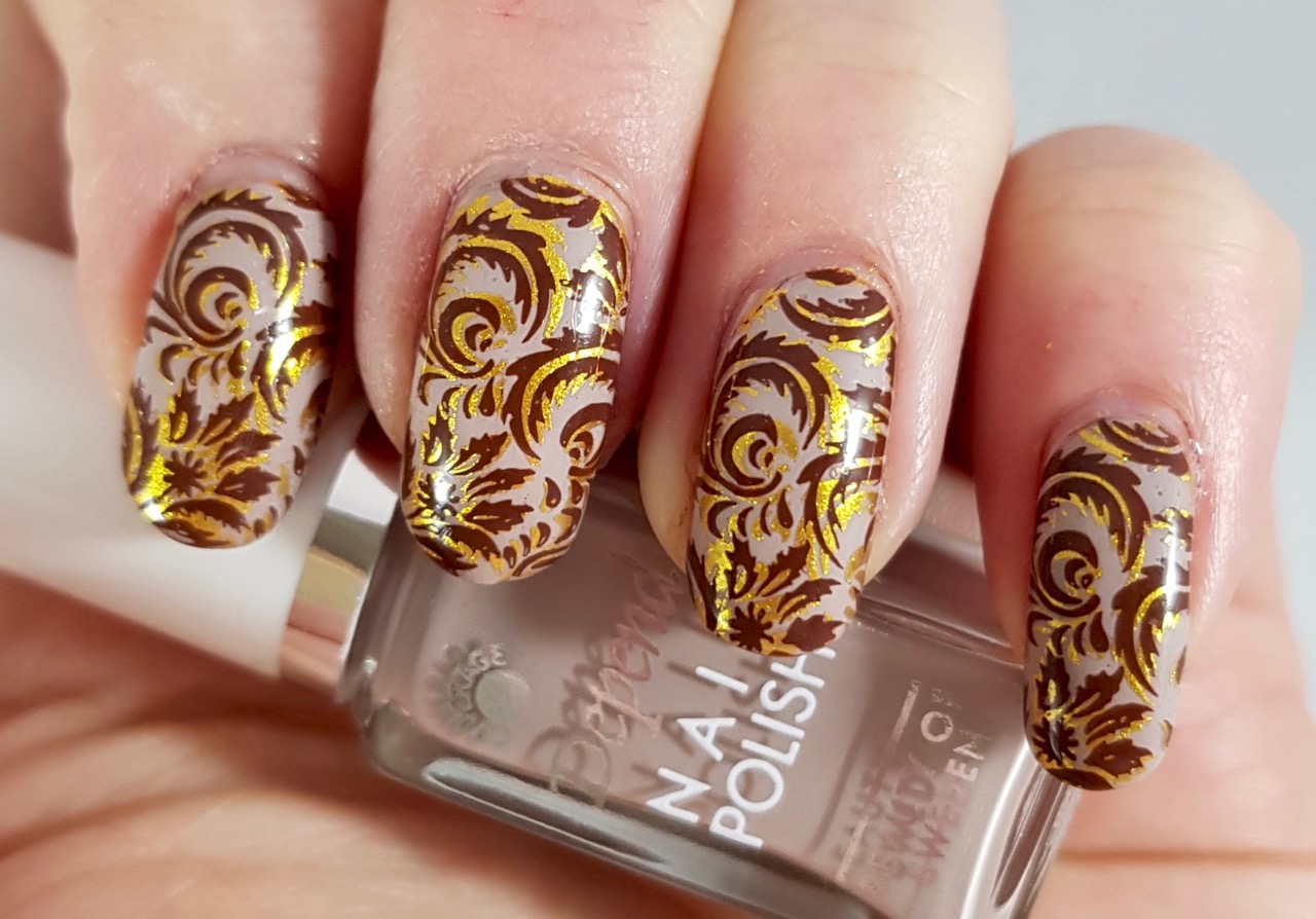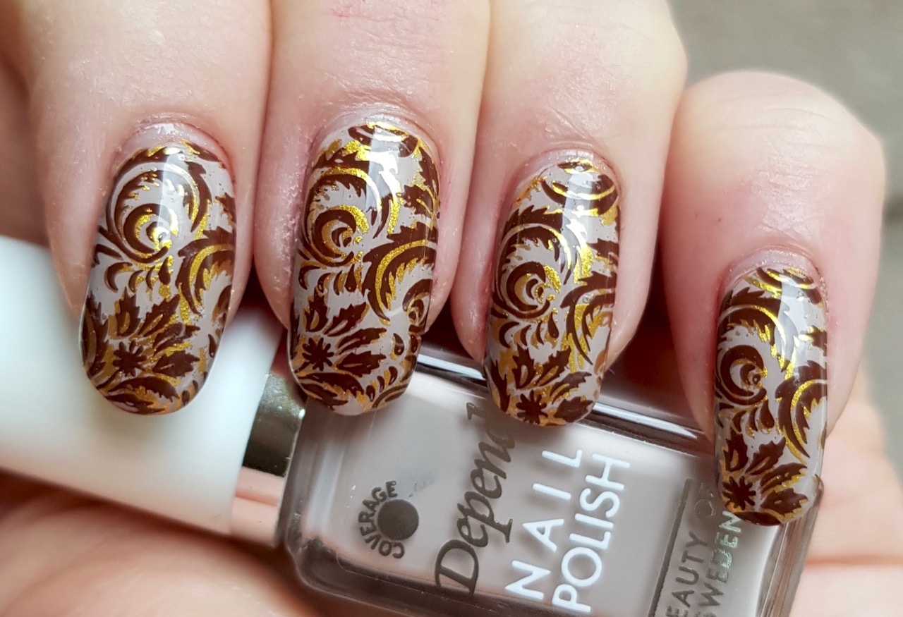 Det där med att passa in stämpling är knepigt, men man kan utnyttja att man är lite vinglig på handen genom att dubbelstämpla som jag gjorde här. Guldlacket blir som en effekt som piggar upp det bruna. Jag tycker faktiskt att det blev jättefint och gillade verkligen den här manikyren!