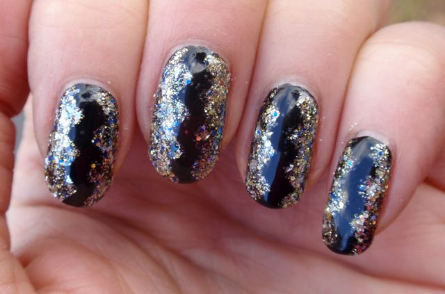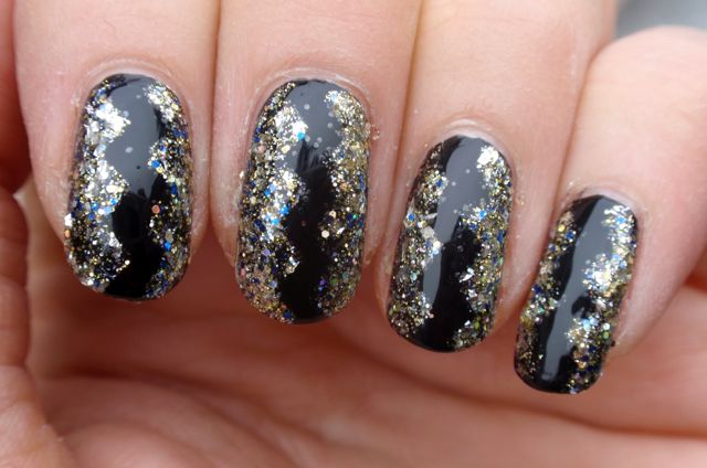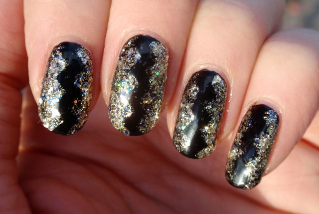 Nu tycker jag att jag har blivit lite enformig vad gäller märkena jag bloggar om, så jag tar och kör en gammal manikyr från 2014 med ett lack från Dollish Polish som omväxling. These Are Not The Droids You Are Looking For är förstås Star Warsinspirerat, närmare bestämt är det C3PO och R2D2 som har fått stå för inspirationen. Det här är en glitterbomb av rang, som har prismatiska glitter i både guld och silver (även om det ser mest guldigt ut), accentuerat med blått. Riktigt härligt blingigt! Jag använde nagelvinyler och applicerade det över två lager av ett svart krämlack (A-England Camelot). Enkelt, men blingigt!