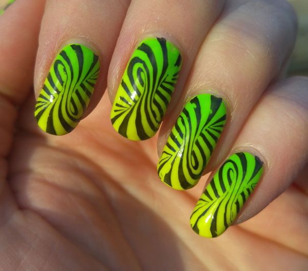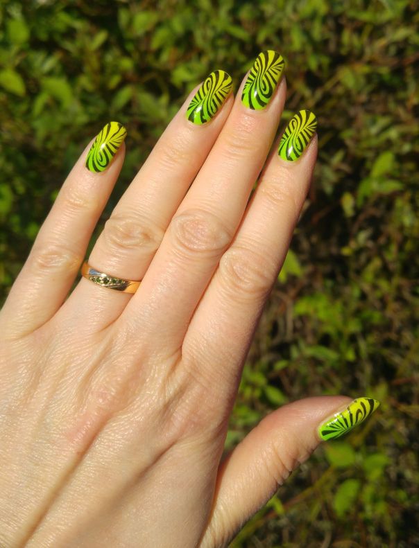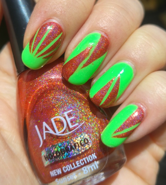 The base is Santorini from Lyn B Designs, which is a light green neon. And jeez, what a green it is! It is almost glowing! It didn’t need any undies, either. I wore three coats of it without any white base. It was a bit thick, but still possible to get even. I did the nail art by painting Jade Sunset on my silicone mat and then cutting it into thin triangles after it had dried, which I applied with top coat. And then I smashed my middle finger into a glass and mushed it up, of course. 😛 But apart from that, I liked this manicure.