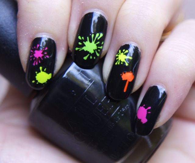 Neondelen av temat fick Cirques glitteröverlack Electric Circus stå för. Det är ett rätt roligt lack och det gjorde i alla fall manikyren lite roligare, även om den fortfarande inte var snygg. Jag smäckte också på lite neonsplatterklistermärken från She Sells Seashells för att försöka piffa upp den. Slutresultatet blev inte direkt vackert, men i alla fall lite ganska roligt.