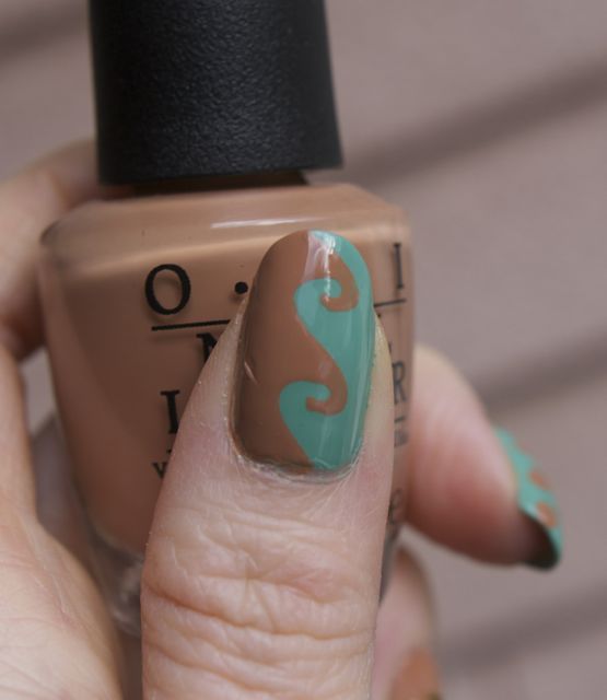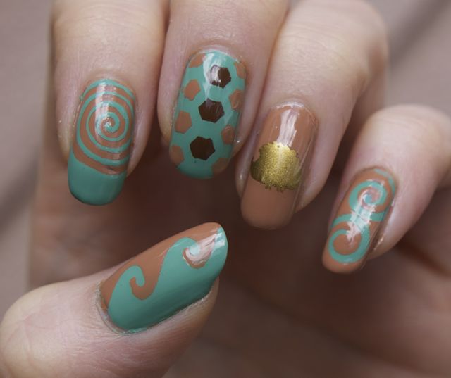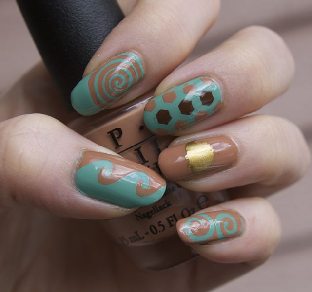 Mitt G-lack till Lacky Corners ABC Challenge blev Going My Way or Norway? från Nordickollektionen, tillsammans med My Dogsled is a Hybrid från samma kollektion. Det första är ett rätt ljust brunt krämlack, som jag faktiskt inte tycker är särskilt snyggt alls. Jag hade svårt att komma på någon nail art för att pigga upp det, då min mans bästa vän påpekade att det funkade rätt bra med lacket jag hade på mig just då – dvs My Dogsled is a Hybrid, vilket han hade rätt i. Det är en färgkombination som ger mig 70-talsvibbar, men jag tycker den funkar hyggligt i alla fall. Jag lekte lite med vinylmallar från TwinkledT och de här två lacken (plus mörkbruna NfuOh 539 på långfingret). Igelkottsklistermärket är från She Sells Seashells. Jag gillar manikyren som koncept, men jag bar den bara en dag eftersom jag har så svårt för Going My Way or Norway?. Jag tycker helt enkelt att det är rätt gräsligt fult. Det kan nog vara ok som accentfärg, men för sig själv så blir den bara lite väl diarrebrun.