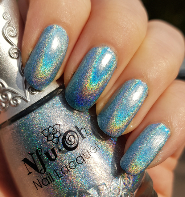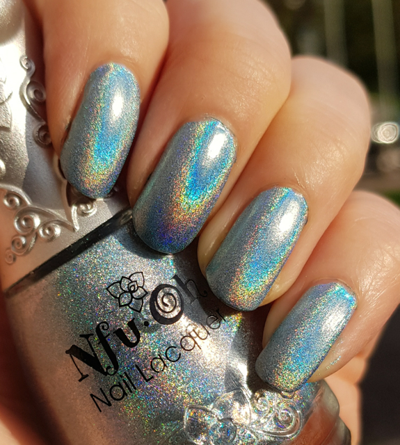 Lacket då? Det är som sagt väldigt vackert och det här är vad holo är när holo är som bäst. Regnbågarna är inte blyga av sig utan syns i alla ljus och i solsken blir man helt knockad av dem. Hololacken från NFu Oh (i alla fall de som fanns då) är ganska lika. Just det här är ljusblått och de andra är också ljusa. På den här tiden var de flesta hololack väldigt ljusa och silvriga eftersom holot dränktes i mörkare färger.