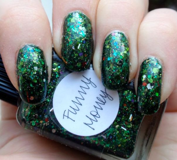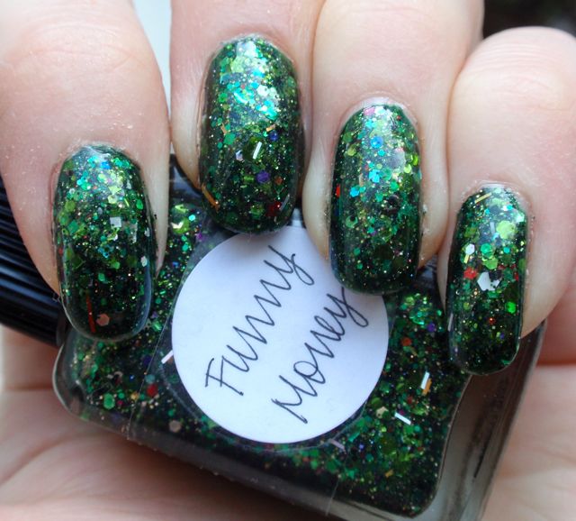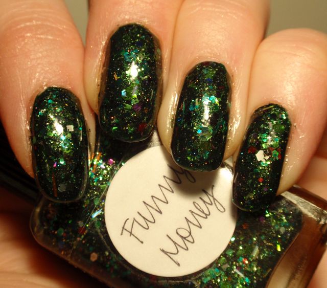 Formulan var, som man kunde vänta sig med allt glitter, lite småknepig. Dock inte på något sätt ohanterlig. Jag har ett lager Nubar Greener under, inte för att jag var orolig för hur väl det skulle täcka, utan för att underlätta borttagningen. Därefter två lager Funny Money, vilket resulterade i massor av glitter som inte var särskilt svårt att fördela jämnt på nageln. Det var rätt knöggligt, så jag har ett lager av ett vanligt långsamtorkande överlack och sedan två lager Seche Vite. Fast ärligt talat är det fortfarande lite ojämnt så det kommer att få ytterligare ett lager Seche Vite imorgon.