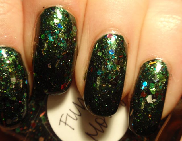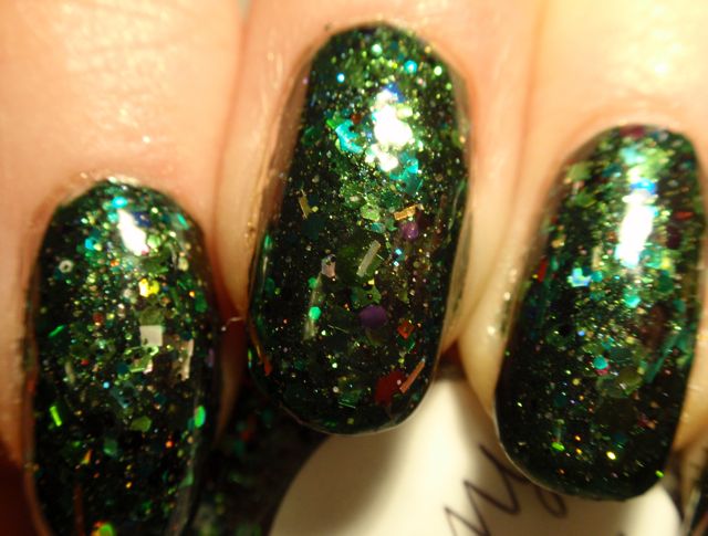 Jag var väl egentligen lite inställd på att bli besviken – jag menar, när något är så otroligt hypat blir det ofta ganska överdrivet efter ett tag. Man gillar något bara för att alla andra gör det. Men jag var ju nyfiken på vad allt prat handlade om, så jag var ju tvungen att testa! Och jag måste erkänna att jag faktiskt är lite kär i det här lacket! Det är massor av olika glitter i det, i alla tänkbara former. De mesta är i olika nyanser av grönt, men det glimmar till av andra färger också, vilket gör det svårt att sluta titta på det. Det händer saker i det hela tiden. Och det är i den där mättade smaragdgröna färgen som jag är så förtjust i…