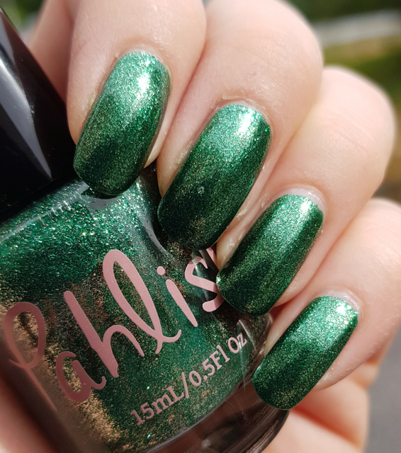 In English: Pahlish has created a bunch of Harry Potter/Fantastic Beasts inspired polishes, and I bought two of them this autumn. The first one I wore was Grindelwald, a lovely muted grey with small gold flakes. I like to wear this type of polish once in a while as a palate cleanser between all the dark and bright colours that I often am drawn towards. This is pretty and a bit special without being too in-you-face or boring. I like it!