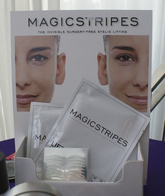 Goodpr representerar också Magicstripes, som säljer en typ av självhäftande silikonremsor som man sätter på ögonlocken för att lyfta dem lite och se piggare ut. Tina (Beleza) testade och det såg ut att göra lite skillnad, faktiskt. Nu såg hon inte så trött ut från början direkt, så det skulle nog göra mer skillnad på någon annan. Jag har rätt tunga ögonlock och är lite sugen på att testa dem någon gång.
