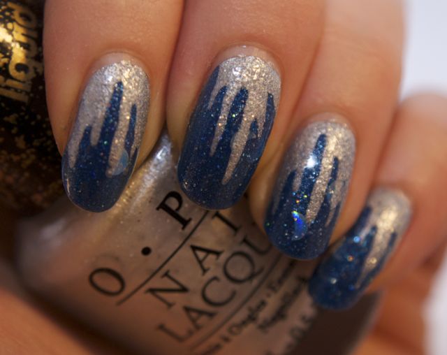 For the icicle decorations I used OPI Solitaire, a nice whitish silvery glitter structure polish, and stencils from She Sells Seashells. I think it turned out quite nice, and very wintery!