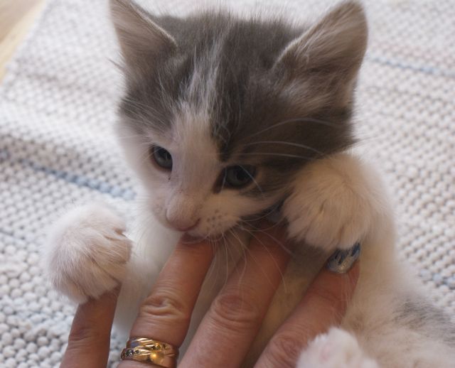 As an apology for my absence, I give you a few pictures of one of the little fluffballs, who was doing his best to ruin my manicure. This was a couple of weeks ago and he was six weeks old then, and cute as a button! (He still is, but a little more long-legged).