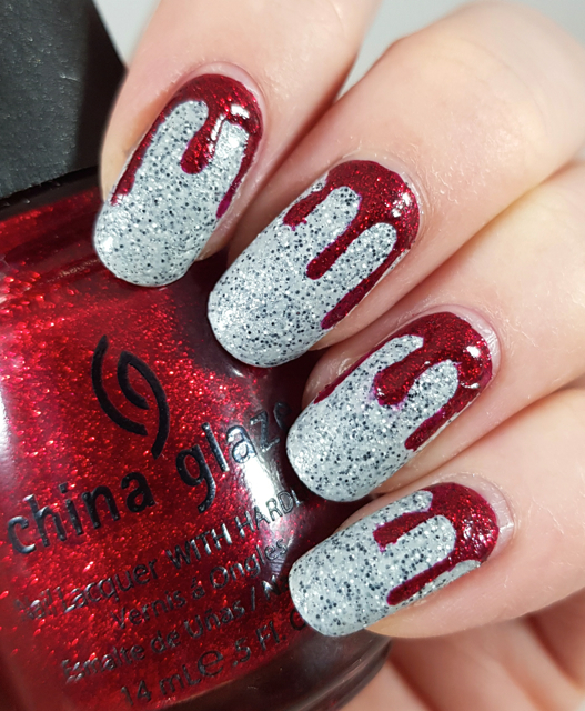 Lacken jag har använt är två gamla favoriter. Basen är Nerdlacquer Don’t Blink 2.0, som är det mest stenlika lacket jag har. Det är ett matt strukturlack med en grå bas och små glitter i vitt, grått, silver och svart. Till ”blodet” använde jag klassikern China Glaze Ruby Pumps. För er som inte vet, så är det lite av det ultimata jullacket. Ett fint rött glitter i en täckande bas. Så himla fint! Det gav precis lagom mycket bling för att göra det här till en lite glammig variant av Halloween. Jag gillar kontrasten mellan den matta, stenlika basen och det glittriga blodet!