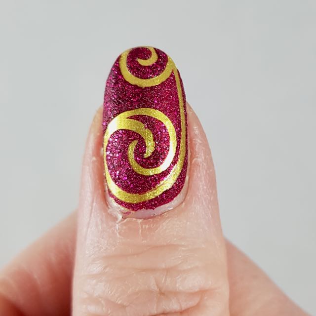 The following day, I used nail vinyls from Glam My Mani and Depend O2 Secret Santa, a press sample from the 2017 Christmas collection Time to Sparkle, to create the swirls. Secret Santa is a very pretty red textured glitter that applied well, dried quickly and was opaque in one coat. It was also in the Rough Glitter collection 2016, so I actually have two bottles.