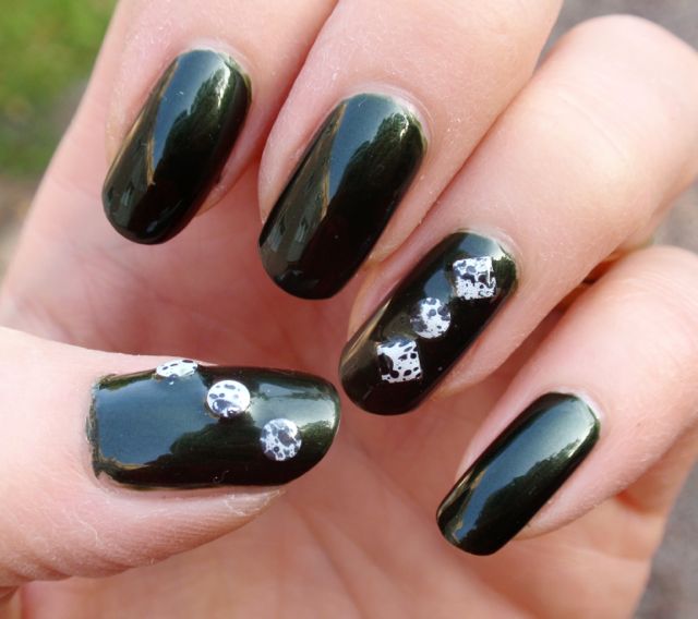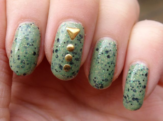 This week, Karin at Vacker och Underbar is holding a green theme week to bring attention to depression. My contribution today is Zombie Flesh, a Mystery Bonus Shade in this year’s Halloween collection from Dollish Polish. It is a sickly green with glitter in black, gold and green. A little wierd, but I love it! I wore three coats. It was a little thick, but managable. As a decoration I added a few gold studs to the long fingers.