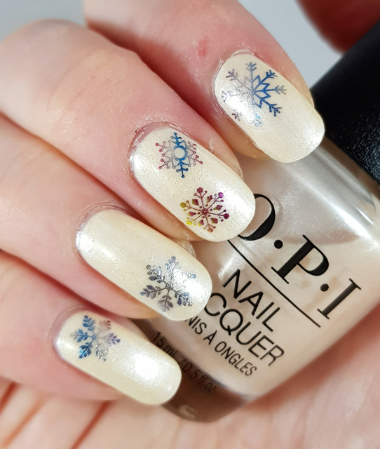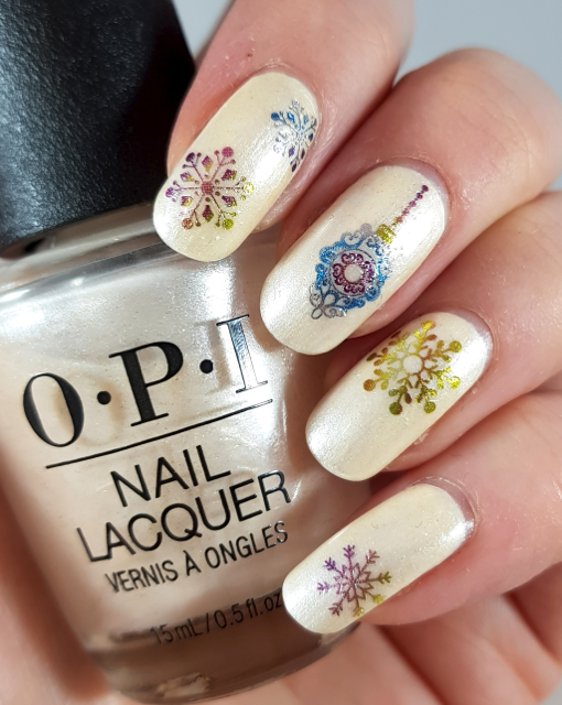 I have actually not shown you my Christmas Eve manicure yet. The base is OPI Snow Glad I Met You, that I have gotten as a press sample from the Love, OPI Christmas collection 2017. I have not worn it myself before now, but I did use it for a friend’s wedding manicure last autumn. (That manicure is still in the archive, I’m afraid.) It is a beautyful white polish in a warm tone with pink and gold shimmer. White can be a bit difficult to wear, but this I think this is very pretty and much more wearable than stark white cremes. The only con is that it is very sheer. I wore it over the white base coat OPI Put a Coat On! (also a press sample), but I still needed three coats. And it was still a bit uneven!