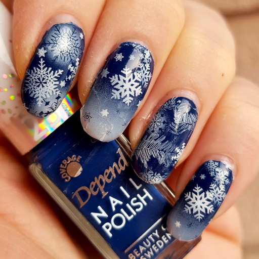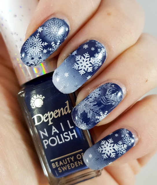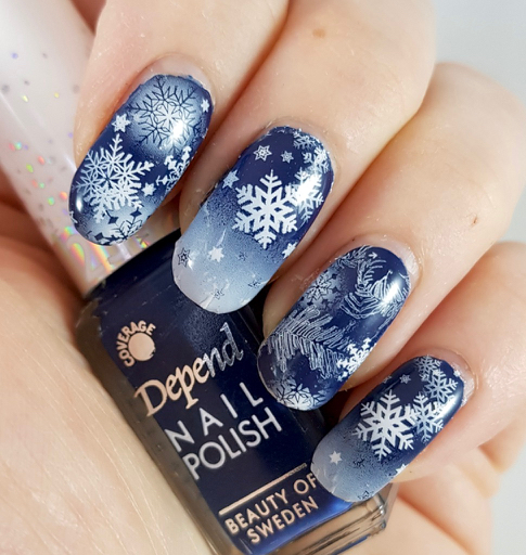 För några dagar sedan fick vi äntligen snö, vilket var ett enormt lyft efter en lång, mörk och regnig november. För att fira detta så tyckte jag att det var på sin plats med en snöig manikyr, så jag plockade fram några vattendekaler från Fashion Nails, som jag köpte från What’s Up Nails tidigare i år. Som bas hade jag Depend 601, ett lite dämpat mörkblått krämlack som jag har fått som pressprov från Tokyo Street-kollektionen. Färgen är inte direkt unik, men lacket var bra att applicera och täckte utan problem på två lager.