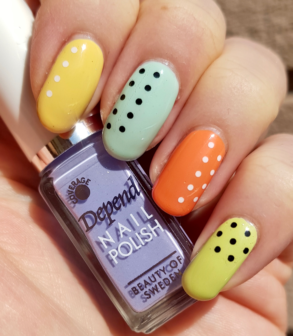 I chose five pastel Depend polishes from the summer collections; four from Brand Me and one from Game On (al are press samples). From thumb to pinkie it is 627 (Brand Me), 630 (Brand Me), 628 (Brand Me), 620 (Game On) och 629 (Brand Me).