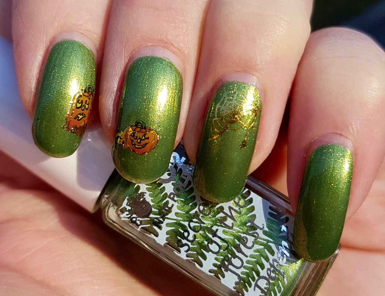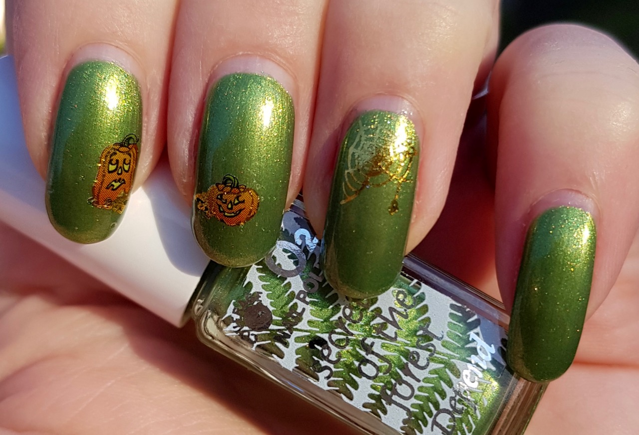 Jag ska chocka både er och mig själv med att blogga två dagar i rad. 🙂 (Måste ju visa halloweenmanikyrerna innan det har gått alltför långt efter Halloween…) Det här var en rätt oinspirerad variant av halloweenmanikyr – jag klämde bara dit några gamla vattendekaler. Baslacket är väldigt fint i alla fall! In Fairy Light är ett pressprov från Depends Secrets of the Forest-kollektion. Det är ett riktigt trevligt äppelgrönt skimmer. Jag bar tre lager. Det hade en viss tendens till att visa penseldrag, men var annars bra att applicera.