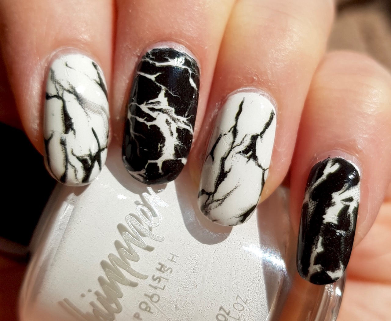 I ett försök att komma igång med bloggandet igen så har jag varit med i en utmaning på Instagram som hålls av Heidi (@skull_lover_nails). Temat var marmorering i svart och vitt. Jag drabbades dock av idétorka, så det blev lite av en fuskvariant – vattendekaler. Som bas hade jag två lager KB Shimmer Eyes White Open. Det var lite tjockt och knöligt att måla med, men jämnade ut sig och var helt ok för att vara ett vitt krämlack. Vattendekalerna har jag haft länge, så jag minns inte längre varifrån jag har fått dem.