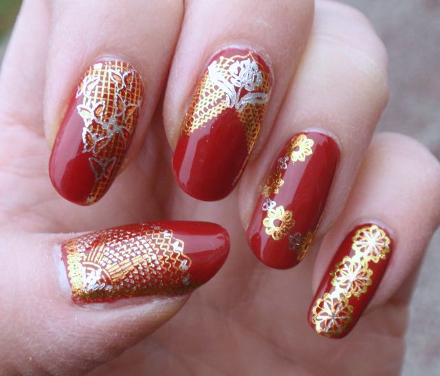 The polish was easy to apply and covered in two coats. It is a fairly classic red, not too dark, which is why I chose it as a backgrund for these water decals from She Sells Seashells. I can’t say that the decals are that elegant, but they are kind of fun and very christmassy. They were of excellent quality, though, and applied nicely.